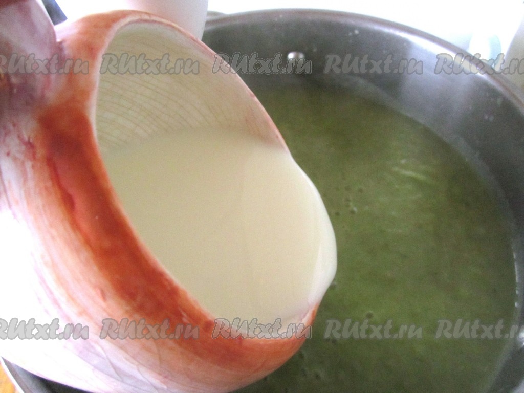Добавьте в суп-пюре сливки и хорошо перемешайте.