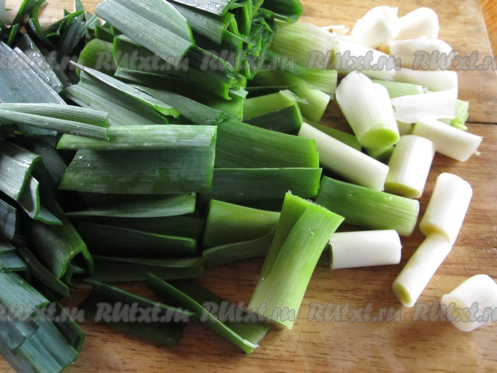Лук-порей нарежьте крупными брусочками.