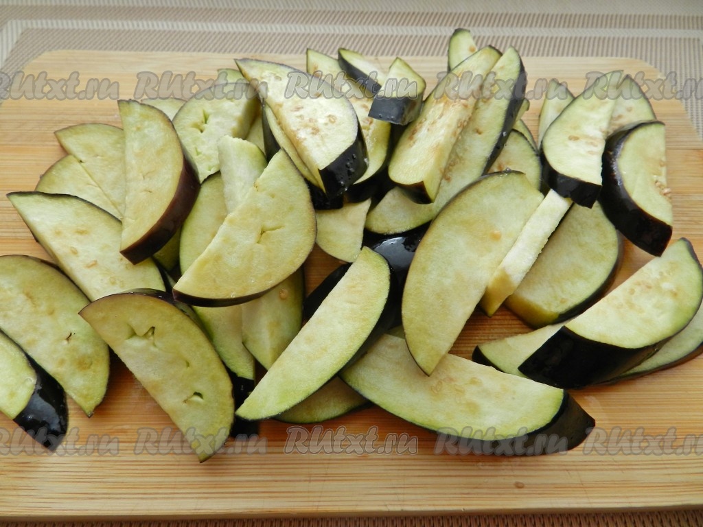 Баклажаны вымыть, нарезать кусочками, посыпать солью и оставить на 20 минут. Затем промыть и обсушить.