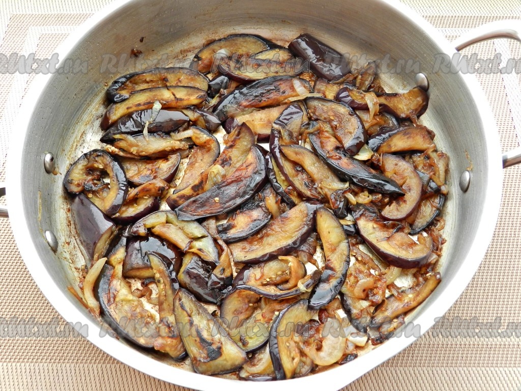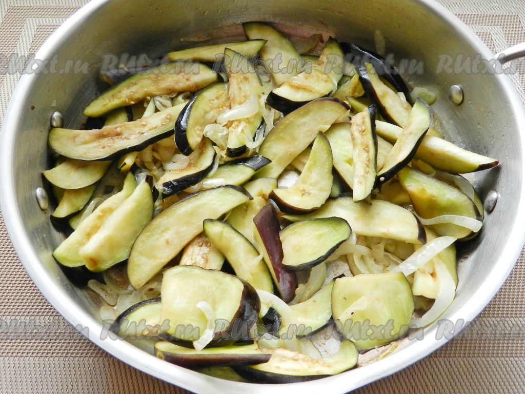 Выложить к луку баклажаны и обжарить все вместе до золотистой корочки, иногда помешивая.