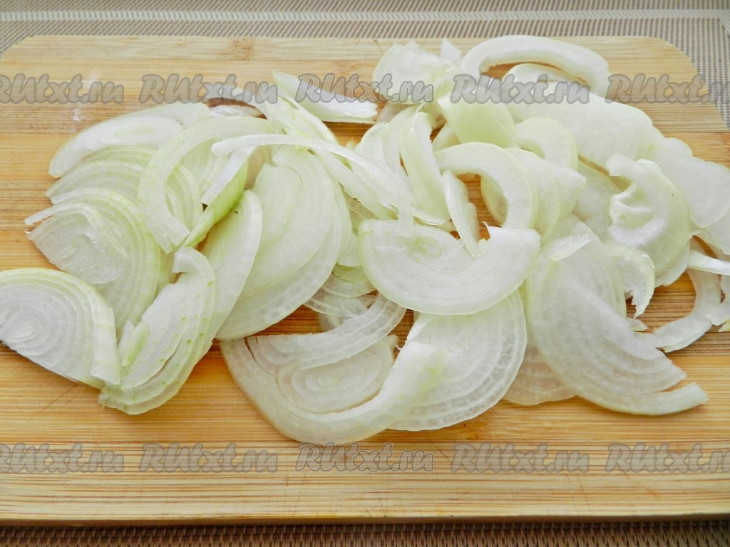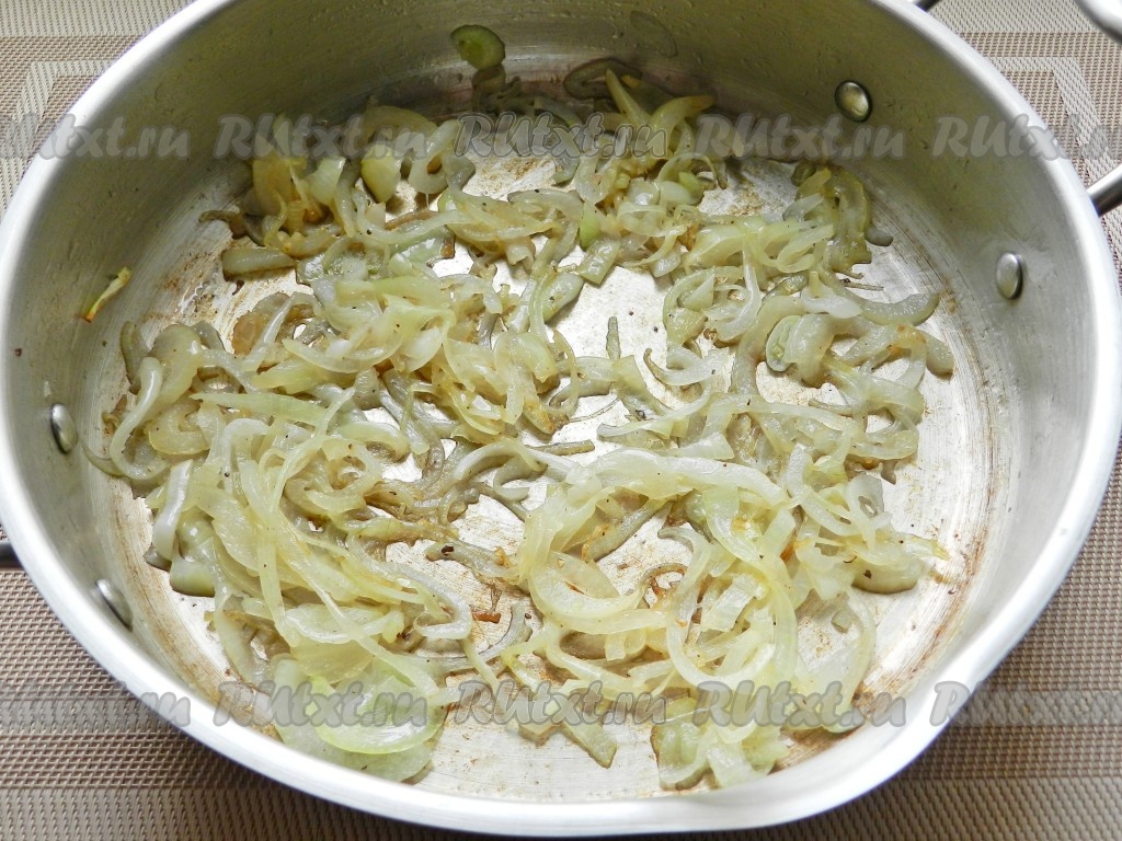 В сковороде разогреть растительное масло и обжарить лук до прозрачности. Посолить и поперчить.