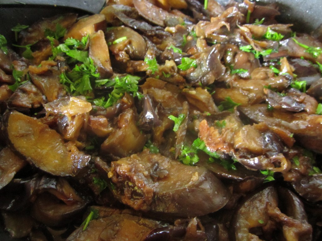 Добавить смесь бальзамического уксуса и соевого соуса в сковороду к баклажанам с луком, перемешать и готовить еще 3 минуты, осторожно перемешивая.