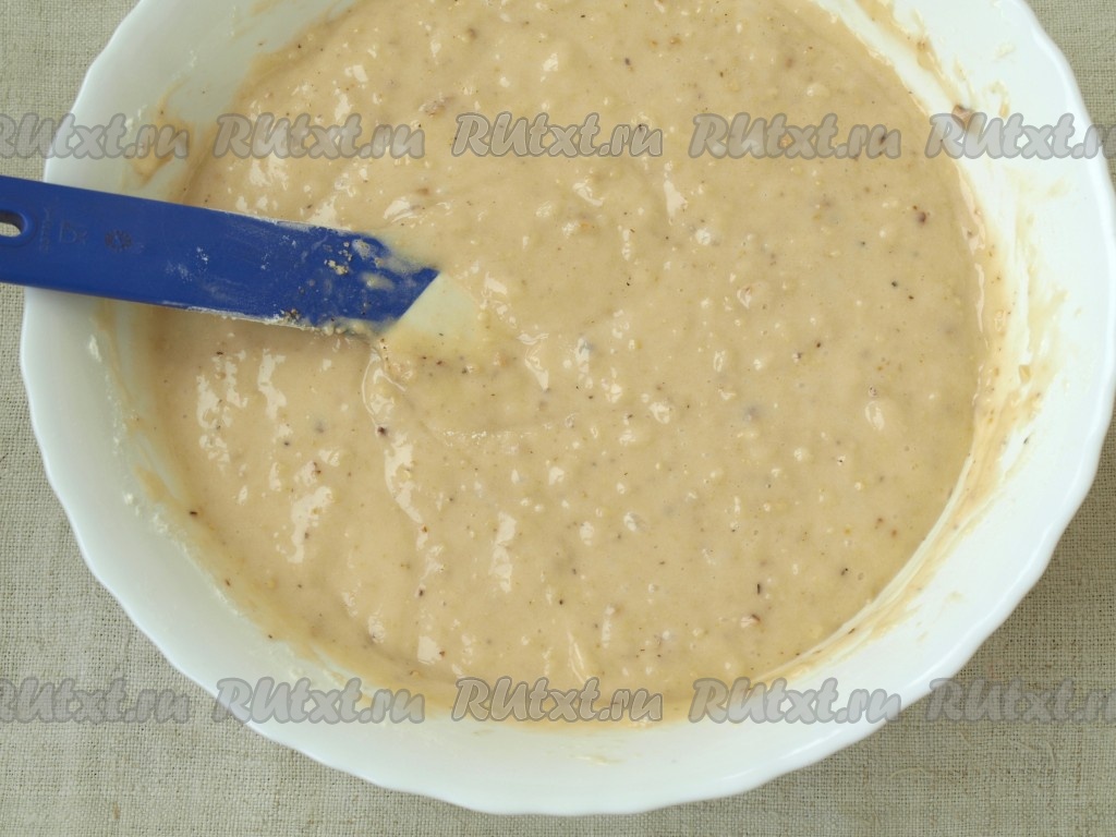 В миску просеять муку с разрыхлителем, добавить щепотку соли. Грецкие орехи обжарить. Измельчить в крошку. Добавить орехи в тесто и перемешать. Консистенция теста будет, как густая сметана.