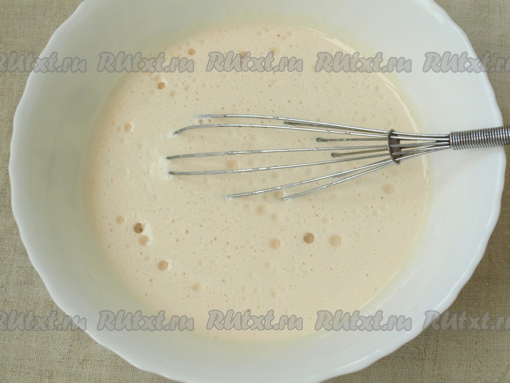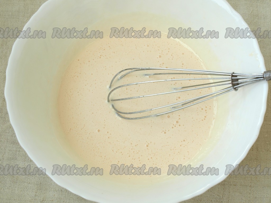 Яйца взбить с сахаром при помощи венчика до побеления массы.