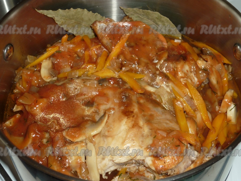 Добавляем 1 стакан воды, лавровый лист, накрываем крышкой и тушим кролика с грибами в томатной подливе 1 час на медленном огне.