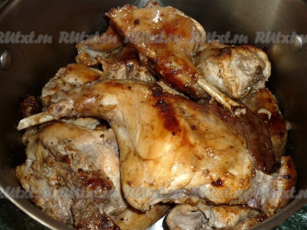 Переливаем получившуюся томатную подливу в кастрюлю с обжаренным кроликом.