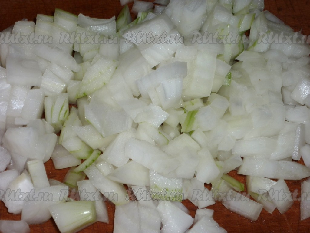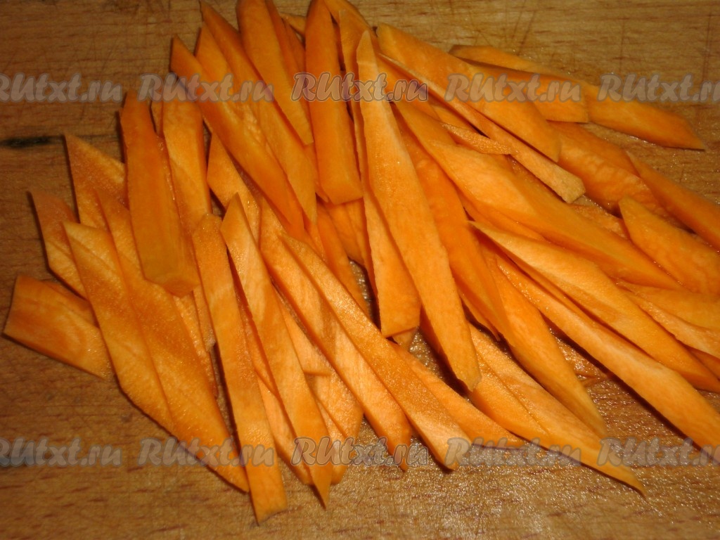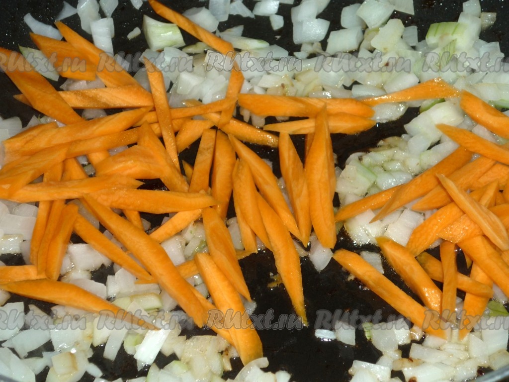 Грибы чистим, моем и нарезаем пластинами. На сковороде, в которой обжаривался кролик, вначале до прозрачности обжариваем лук, затем добавляем нарезанную морковь.