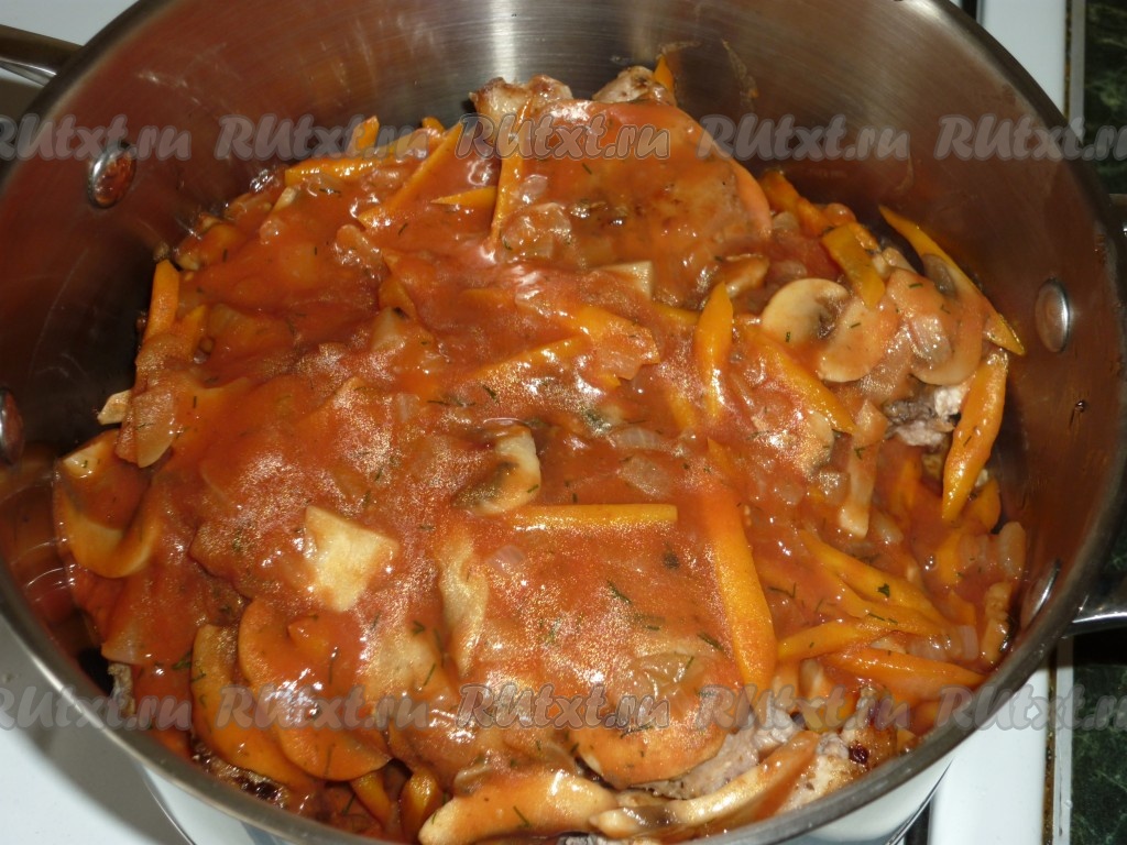 Очень вкусное и нежное мясо кролика в томатной подливе с грибами станет украшением любого стола.