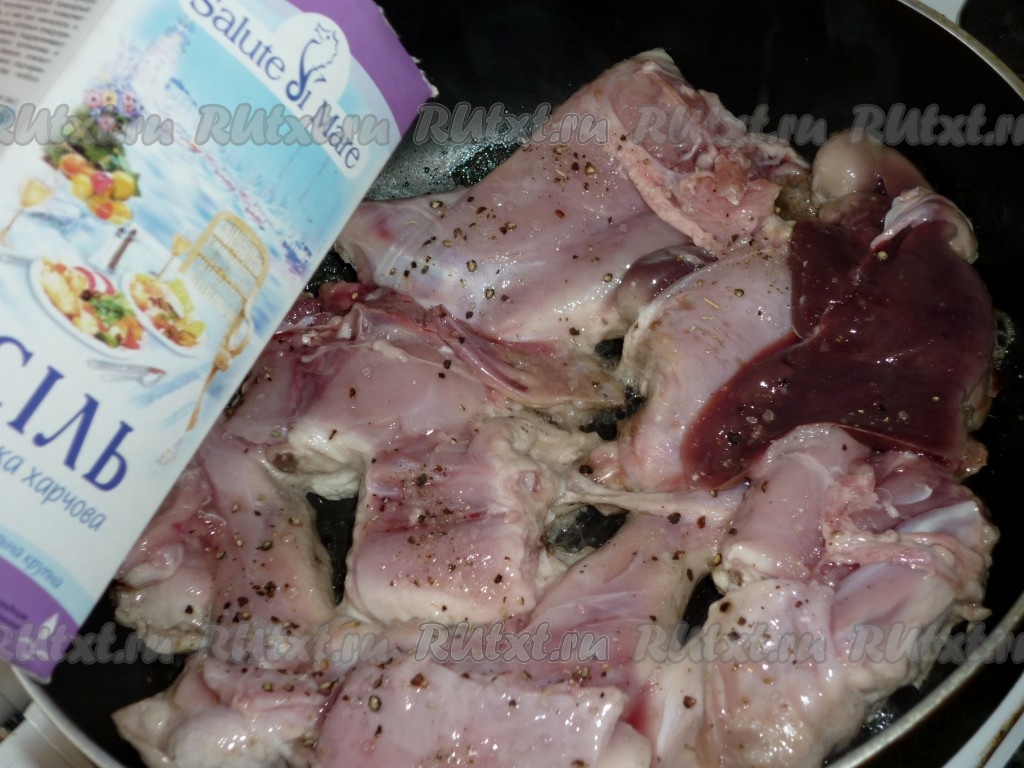 Кусочки кролика солим, перчим и обжариваем на хорошо разогретой сковороде с растительным маслом до золотистого цвета.