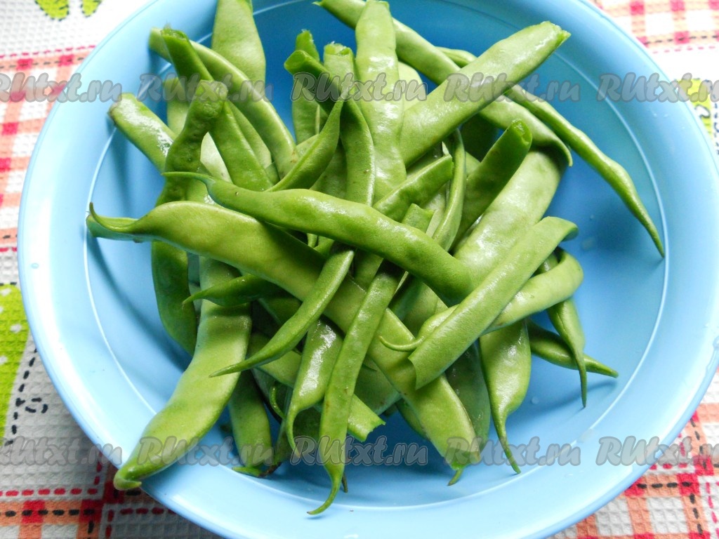 Далее фасоль порезать на 2-4 части наискосок.