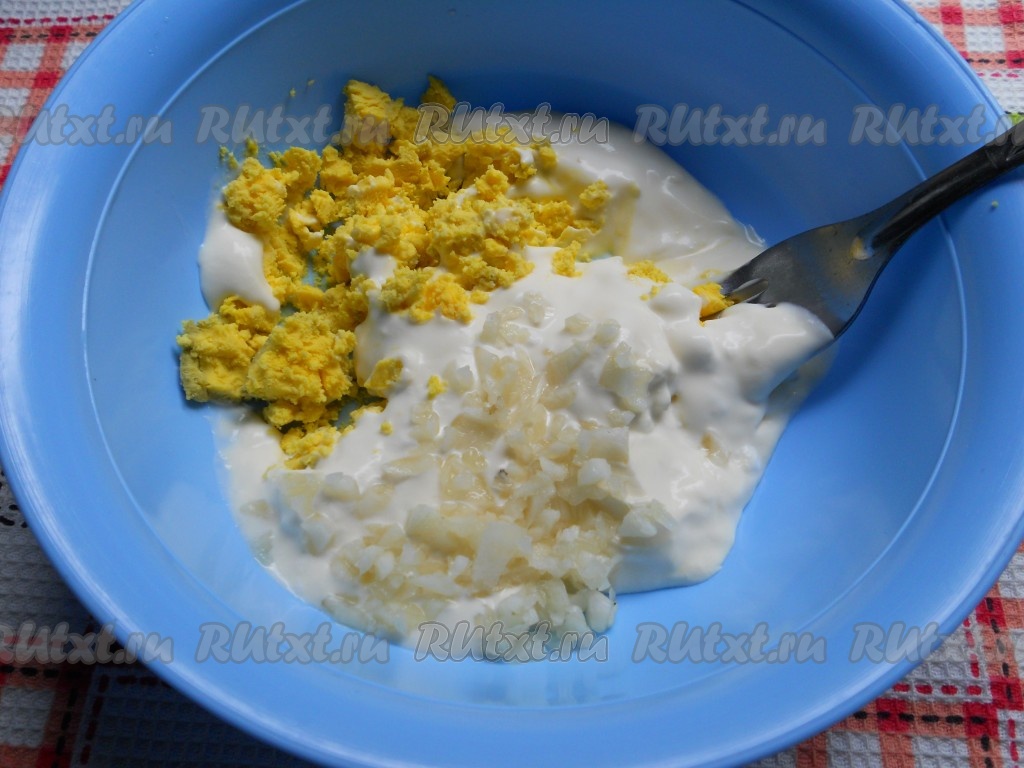Для приготовления соуса в миску со сметаной добавить чеснок, пропущенный через пресс или измельченный ножом, размятый вареный желток и соль.