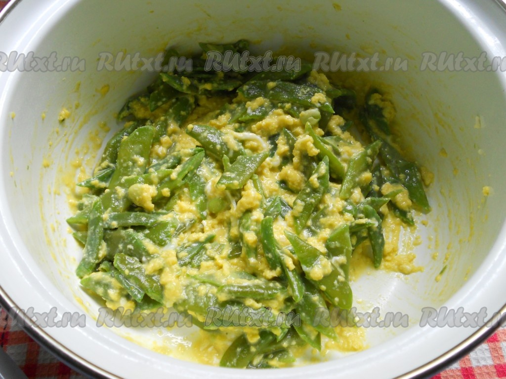 Аккуратно, небольшими порциями влить яйца в кастрюлю с фасолью, тщательно все перемешивая. Когда яйца свернутся, огонь выключить.