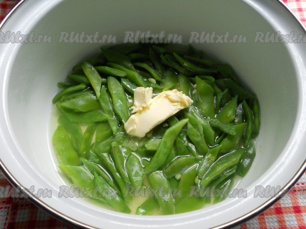 Поместить фасоль в небольшую кастрюльку или сотейник. Влить небольшое количество воды, чтобы она была до половины фасоли. Поставить кастрюльку на огонь. Довести фасоль до кипения, далее варить на медленном огне 7-10 минут. Добавить сливочное масло и соль, перемешать.