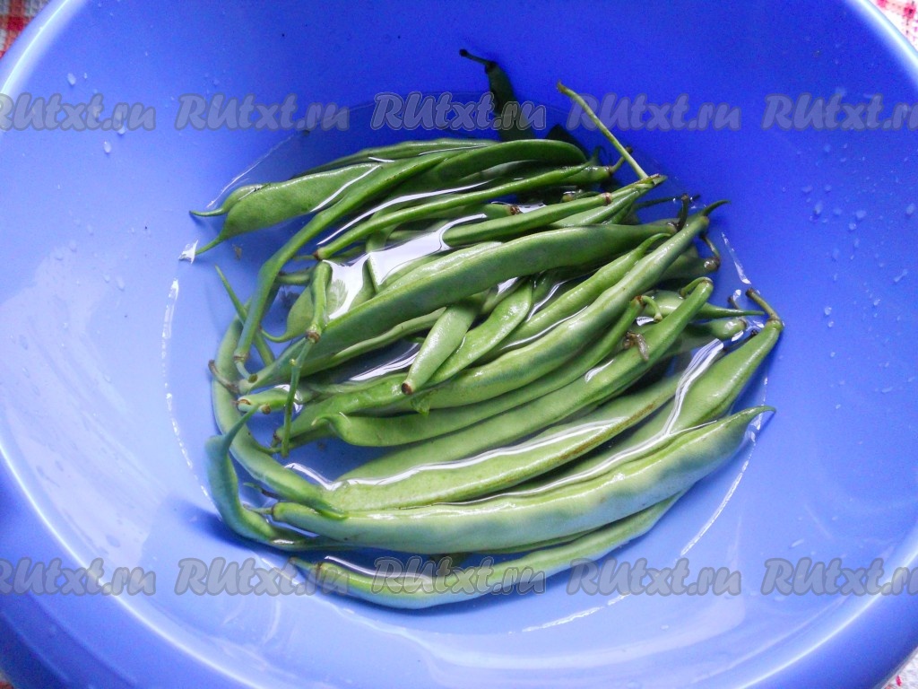 Стручки фасоли поместить в глубокую миску, залить холодной водой.