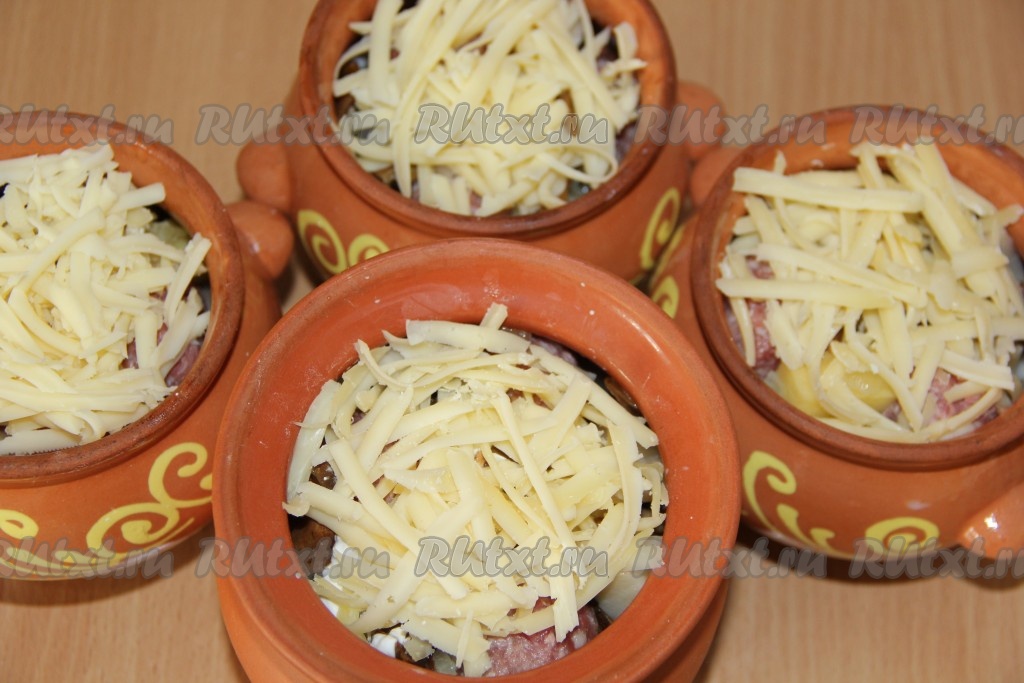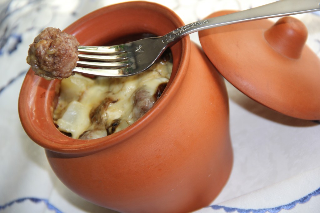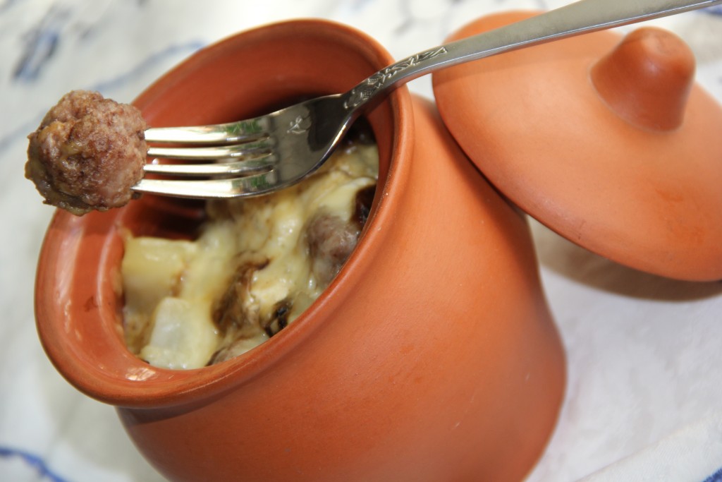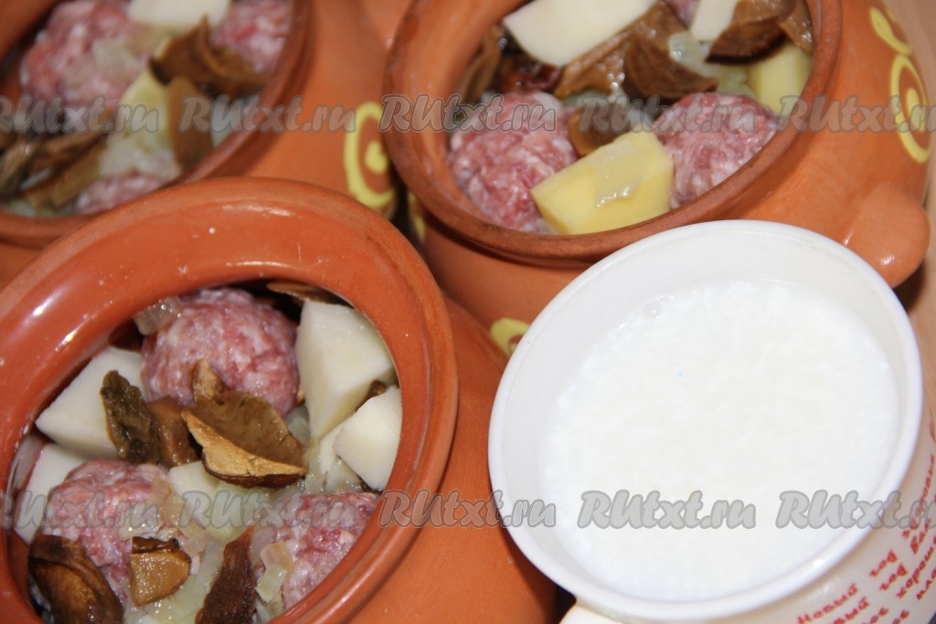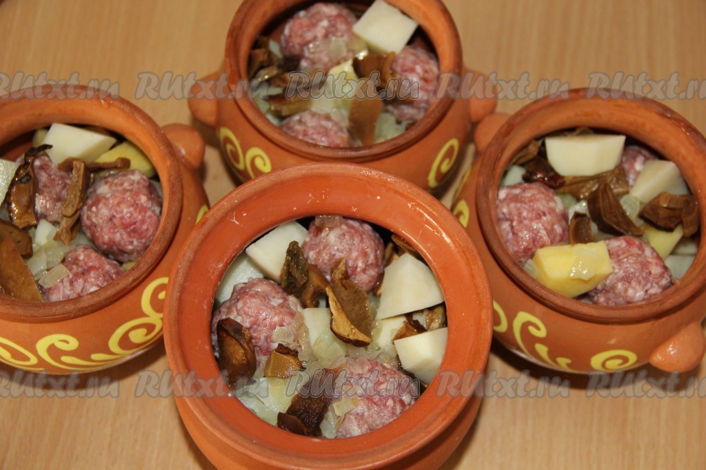 Из фарша сформировать фрикадельки. В горшочки поместить слоями: фрикадельки, нарезанный очищенный картофель, обжаренный лук и грибы.
