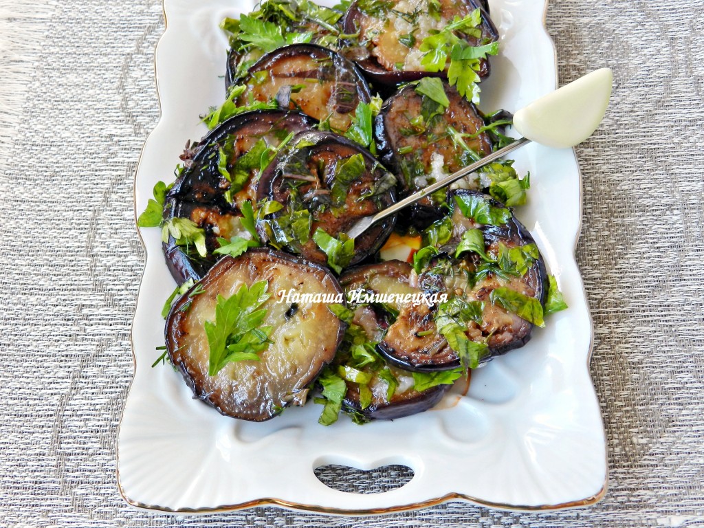 Вкусная и пикантная закуска из баклажанов с чесноком готова.