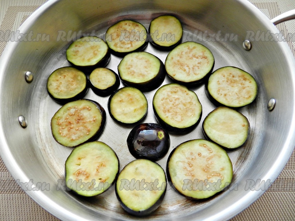 Кружочки баклажанов обжарить в сковороде на растительном масле с обеих сторон до золотистой корочки.