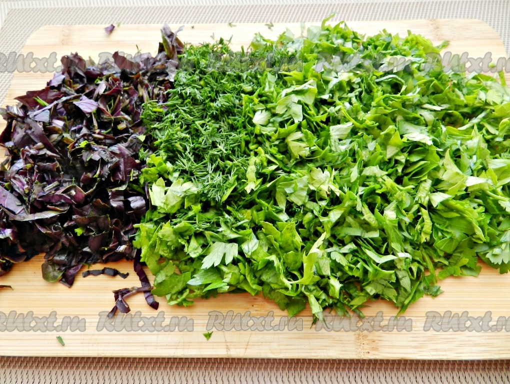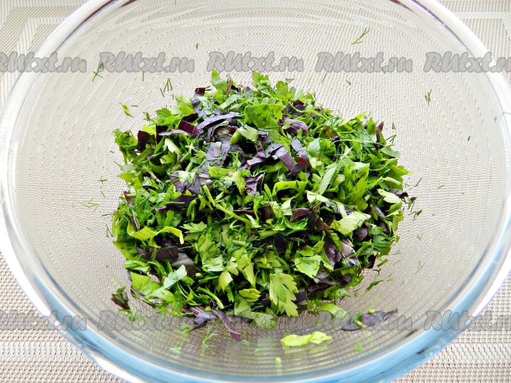 Свежую зелень (у меня - петрушка, базилик и укроп), вымыть, нарезать.