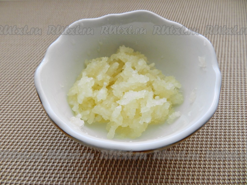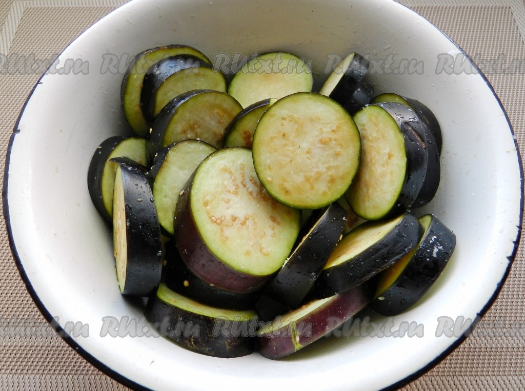 Баклажаны вымыть, нарезать кружочками толщиной не менее 1 сантиметра, сложить в миску и посыпать солью. Оставить на 30 минут. Затем промыть и обсушить.