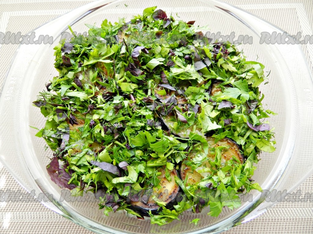 Обжарить следующую партию баклажанов, также окунуть в маринад, посыпать чесноком и зеленью.