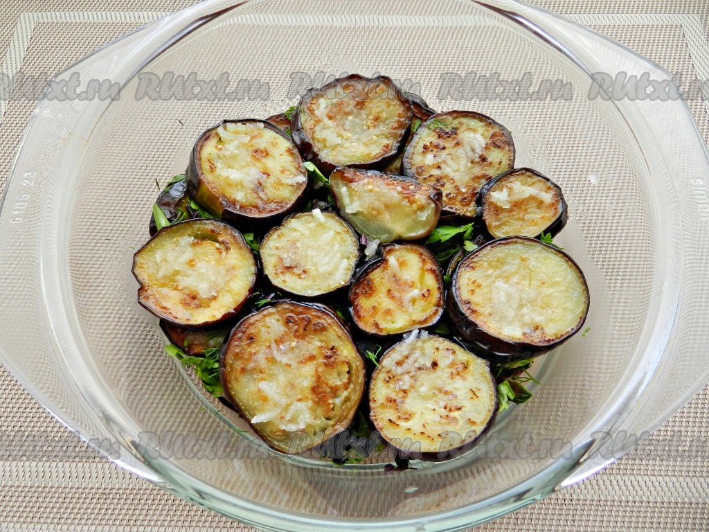 Затем вынуть и разложить слоем на дно стеклянной или эмалированной посуды. На каждый кусочек баклажана выложить чеснок и обильно присыпать зеленью.