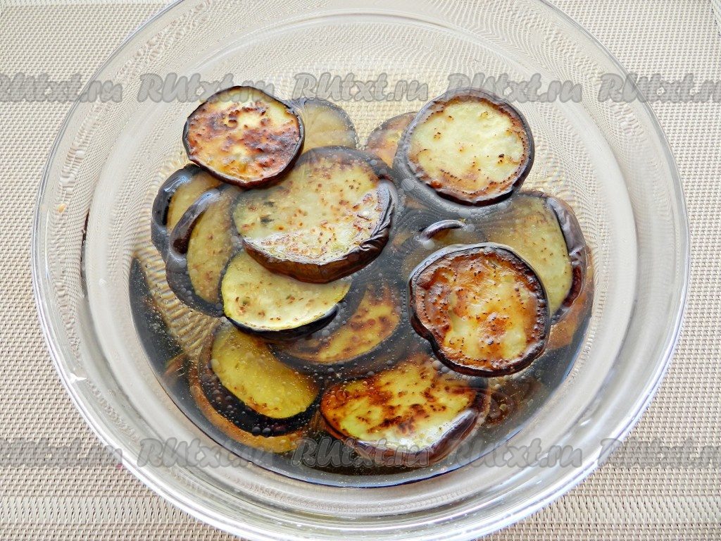 В отдельной посуде развести уксус водой. Обжаренные баклажаны окунуть в маринад.