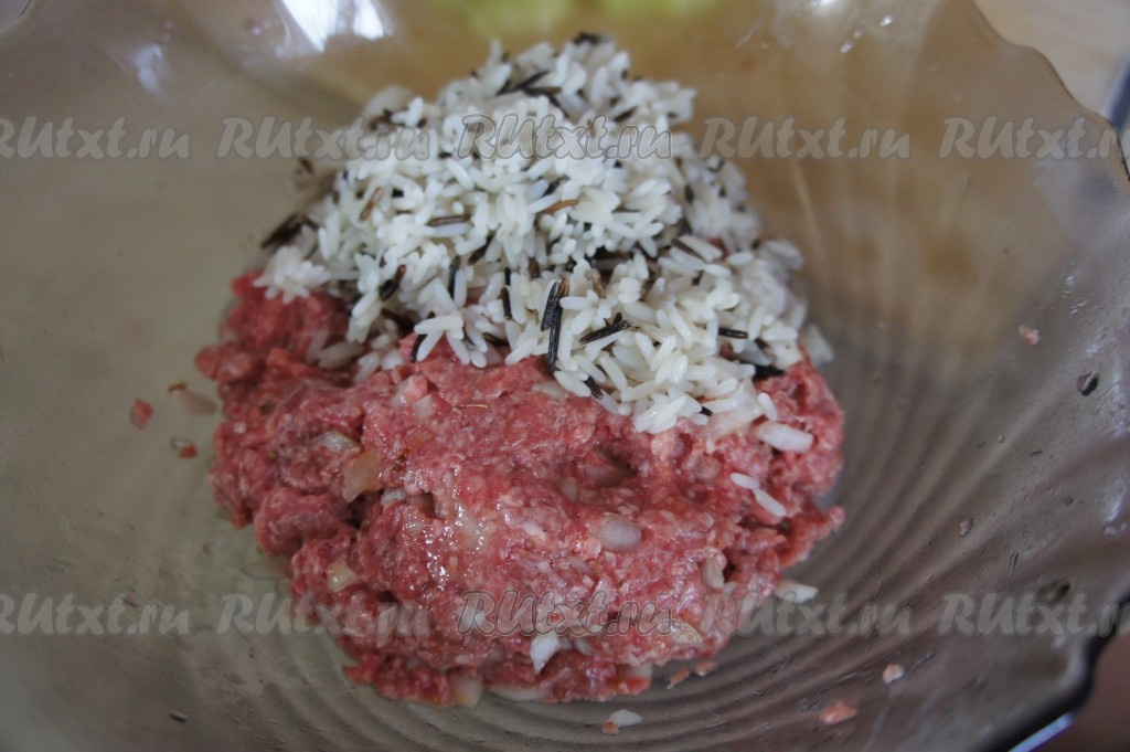 Сюда же выкладываем рис, отваренный до полуготовности, перемешиваем.