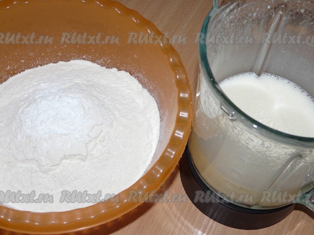 Яйца взбить в пышную пену, затем добавить сахар и взбивать примерно 5 минут. Далее добавить сметану и взбить ещё раз. Просеянную муку смешать с разрыхлителем.