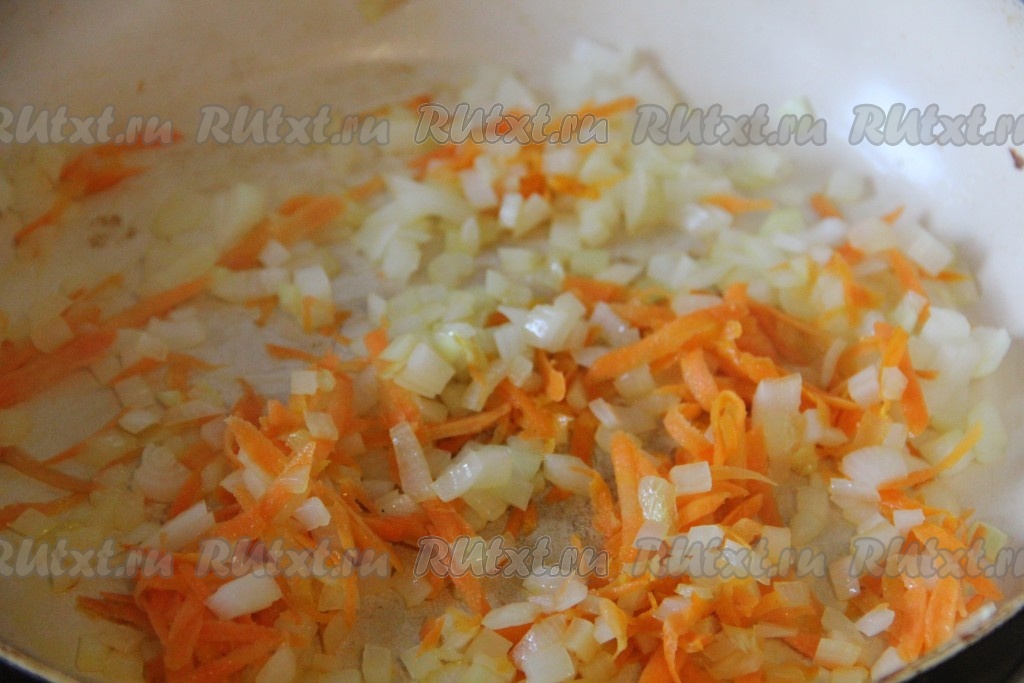 Морковь и лук очистить. Баклажаны тоже можно очистить от кожуры (это сделает блюдо более нежным). Баклажаны нарезать кубиками, посолить и оставить на 20 минут, затем по истечении времени отжать от сока. Мелко нарезанную луковицу и натёртую морковку обжарить на растительном масле на среднем огне до золотистости (на это потребуется минут 5), помешивая.