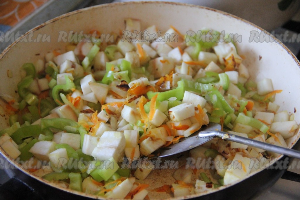 Добавить баклажаны и тушить на медленном огне, накрыв сковороду крышкой, периодически аккуратно помешивая, минут 7. Затем добавить болгарский перец, очищенный от семян и нарезанный соломкой, перемешать, готовить минут 5 (перцы должны стать достаточно мягкими).