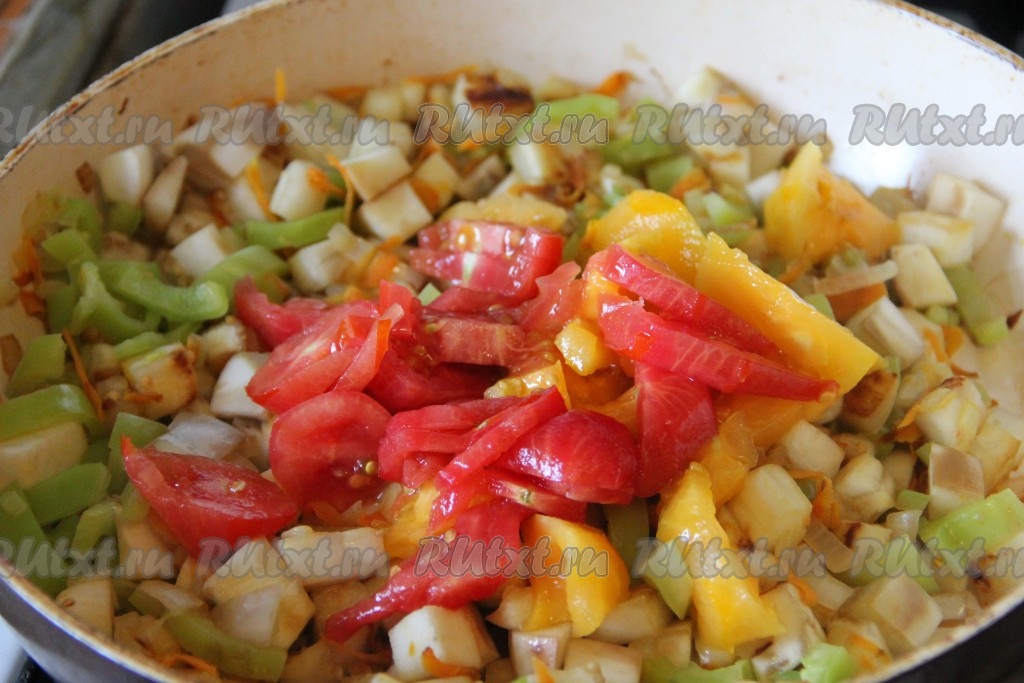 После этого выложить к овощам нарезанные помидоры (шкурку с помидоров лучше снять), посолить, поперчить, по желанию, добавить томатную пасту, перемешать. Если помидоры не очень сладкие, добавьте сахар по вкусу.