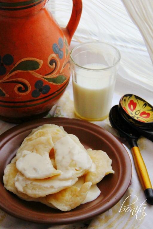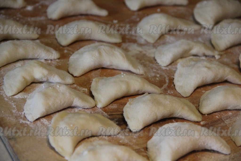 Защипнуть противоположные края каждого кружка, формируя вареник. Постепенно сформировать все вареники. Если вареников получается больше, чем вы можете скушать за раз, тогда часть вареников можно отварить, а оставшиеся вареники выложить в один слой на доску, присыпанную мукой, и отправить в морозилку, после замораживания их можно сложить в пакет и хранить в морозилке, а затем в нужный момент отварить их, помещая в замороженном виде в кипящую воду.
