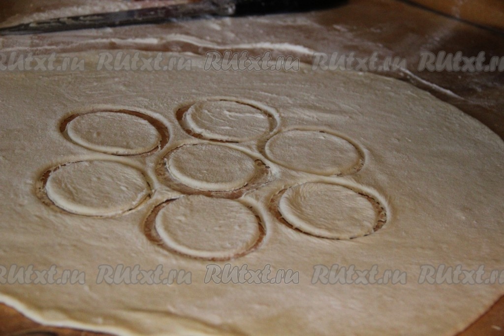 Каждую часть теста на присыпанной мукой поверхности раскатать в пласт толщиной 2-3 миллиметра. С помощью стакана выдавить кружочки из теста.