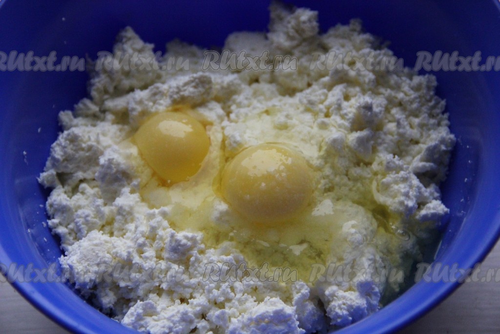 Для приготовления начинки творог подсолить по вкусу и добавить сырые яйца, хорошенько перемешать.