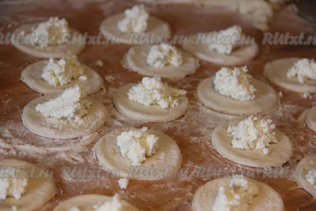В центр каждого кружка выложить примерно по чайной ложке несладкой творожной начинки.