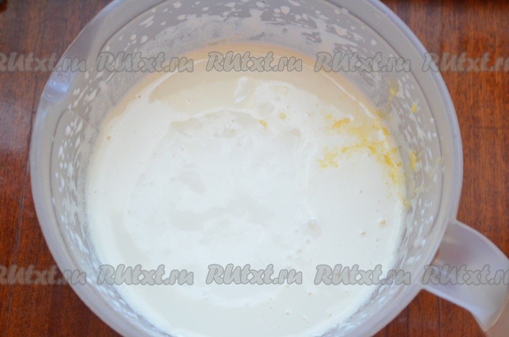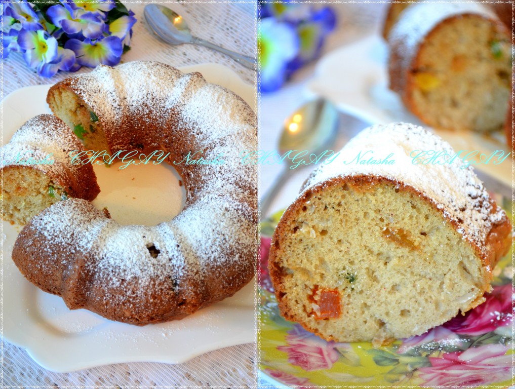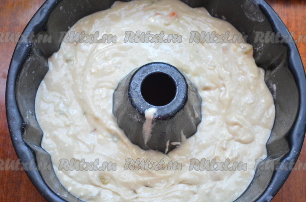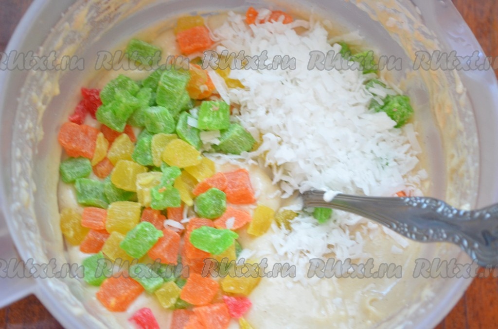 В самом конце добавить цукаты и кокосовую стружку (можно без неё). Перемешать. Тесто для пирога с цукатами получится, как густая сметана.