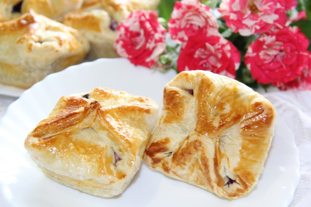 У меня тесто было одним пластом. На присыпанном мукой столе раскатать слоёное тесто до толщины 3-4 миллиметр. Раскатанное тесто нарезать на квадраты одинакового размера (я разрезала на 10 квадратов).