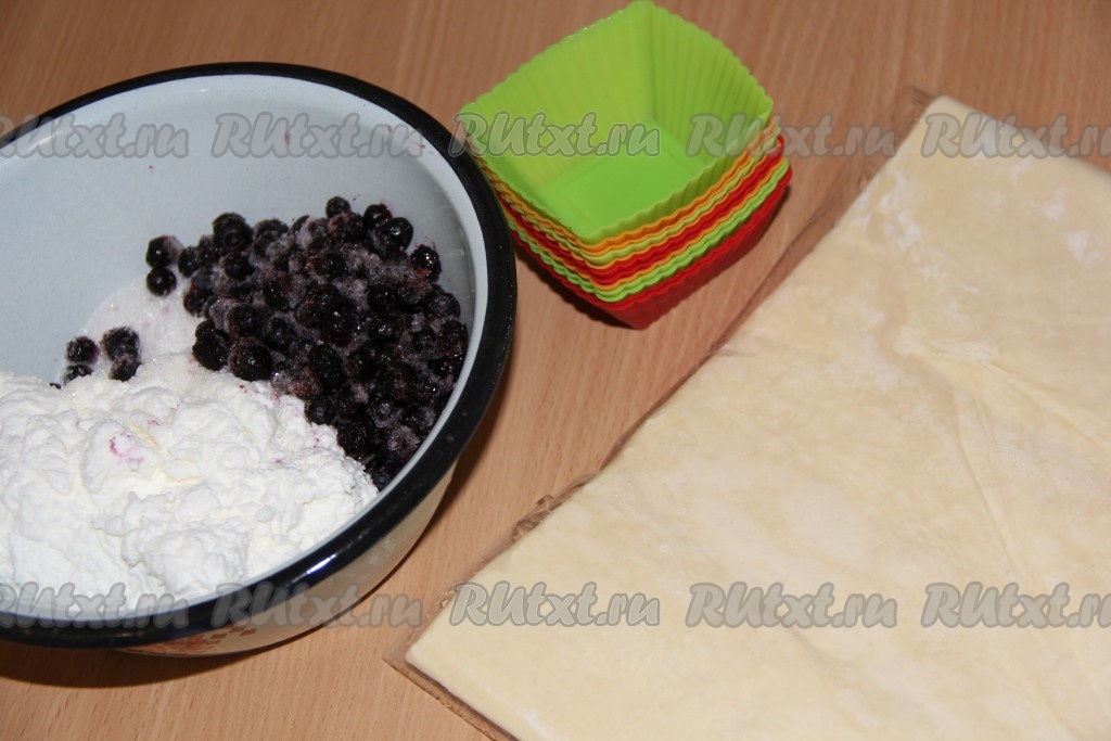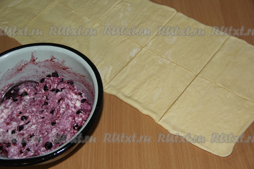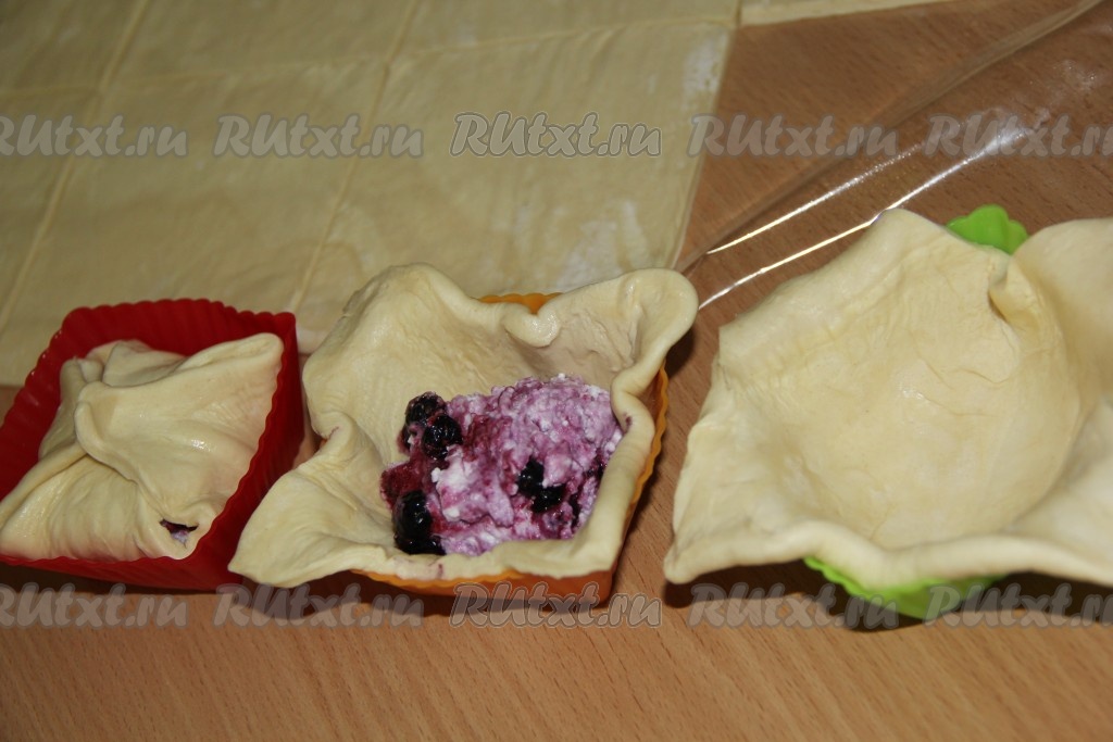 Творожно-ягодную начинку зрительно разделить на такое количество частей, сколько квадратов из теста у вас получились. Эти слойки можно формировать на столе, присыпанной мукой, или в силиконовых формочках, выкладывая квадрат теста так, чтобы края теста свисали с краёв формочек. В центр квадрата из теста, отступая от краёв выложить одну часть начинки из творога и чёрной смородины. Противоположные края квадрата из теста соединить над начинкой, тщательно скрепить, формируя слойку. Если вы формировали слойку на столе, тогда её нужно просто переложить на противень, застеленный пергаментом. Если вы формировали слойки в формочках, тогда просто переставьте формочки со слойками на противень.