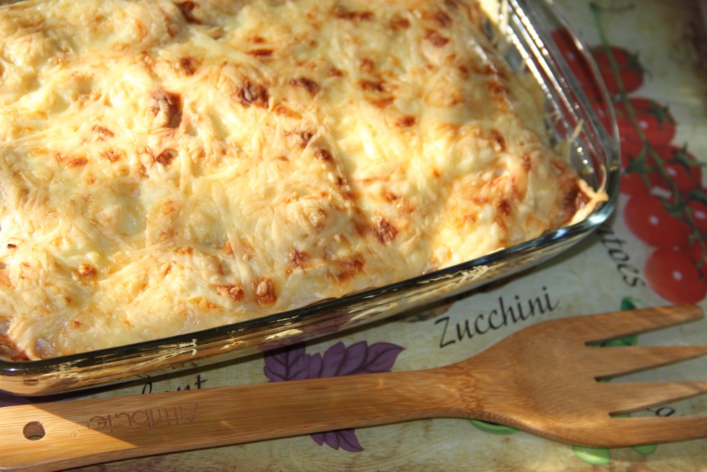 Повторить слои, у меня из этого количества продуктов получилось пять слоёв. Последний слой лазаньи посыпать натёртым сыром.