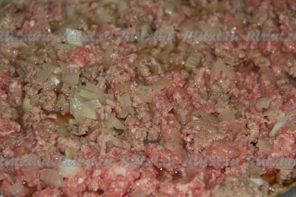 Мелко порезанный лук обжарить на растительном масле до золотистого цвета, затем добавить фарш, посолить и обжарить на среднем огне до готовности.