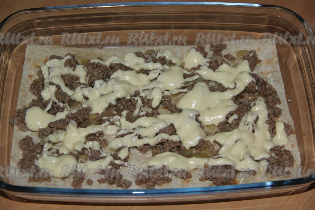 В жаропрочную форму выложить лист лаваша (лаваш предварительно нарезать под размеры формы). Выложить часть фарша, разровнять. Затем полить соусом.