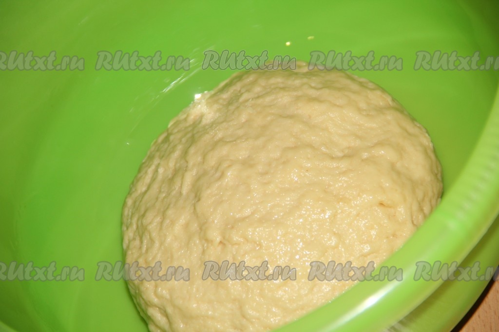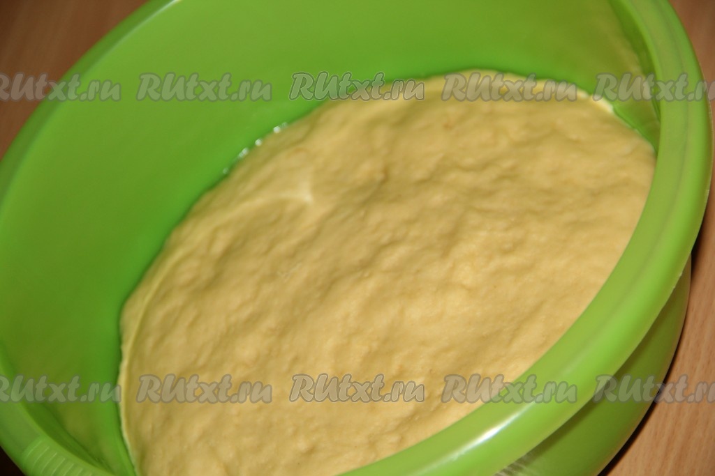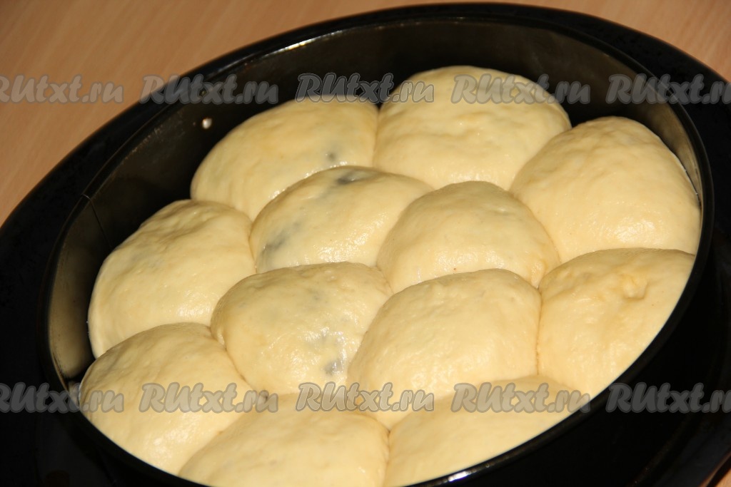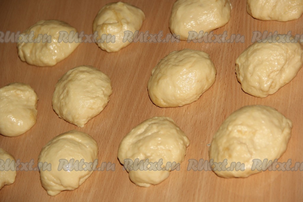 Готовое тесто выложить на стол, припорошенный мукой, и слегка обмять. Разделить тесто на 12 частей.