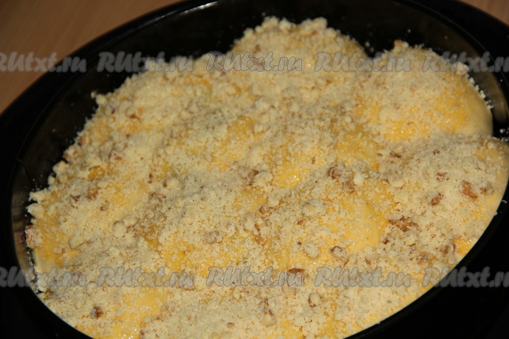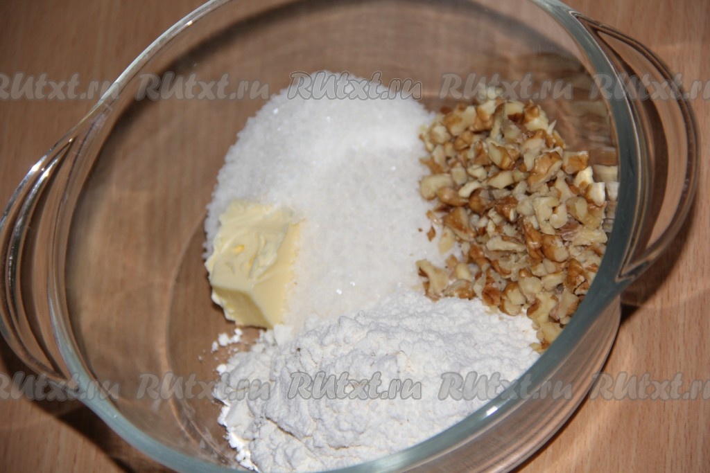 Пока наши булочки отдыхают, приготовить штрейзельную крошку. Для этого нужно соединить муку, сахар, масло и орехи. Растереть руками до образования крошки.