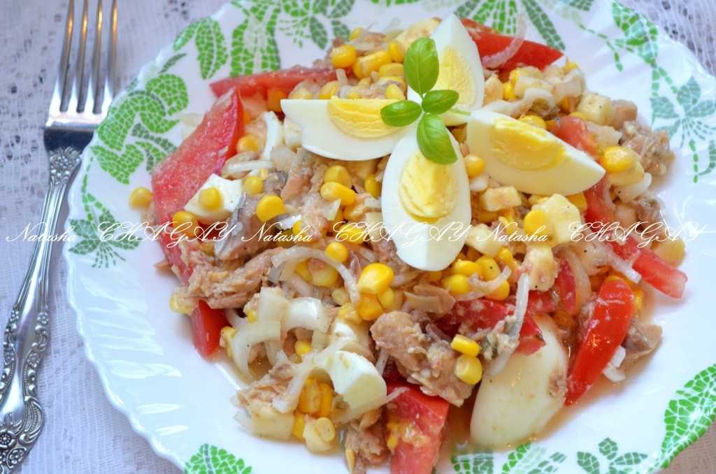 Очень люблю готовить разные салаты: овощные, с мясом, с рыбой, с майонезом, с маслом и т.д. Сегодня у нас на обед был салат с консервированной горбушей, кукурузой и помидорами. Очень вкусный, достаточно легкий и пикантный. Кто любит экспериментировать, советую попробовать этот рецепт салата из консервированной горбуши.