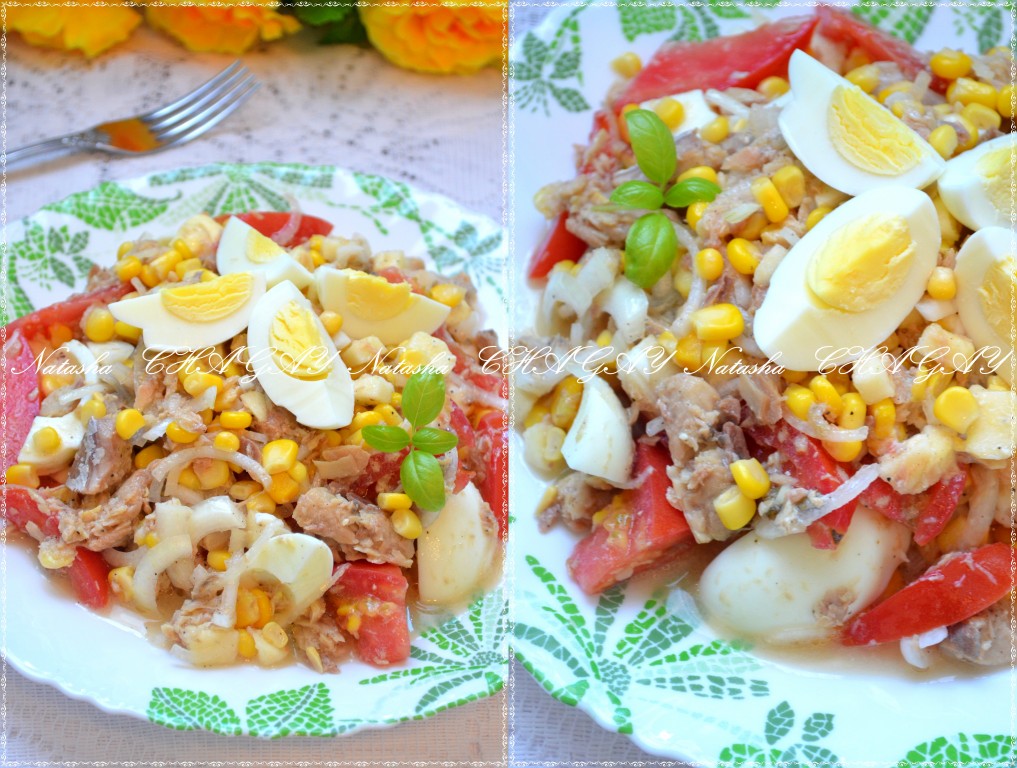Салат с консервированной горбушей, кукурузой и помидорами немного охладить и можно подавать. Надеюсь, вам понравится рецепт этого салата.