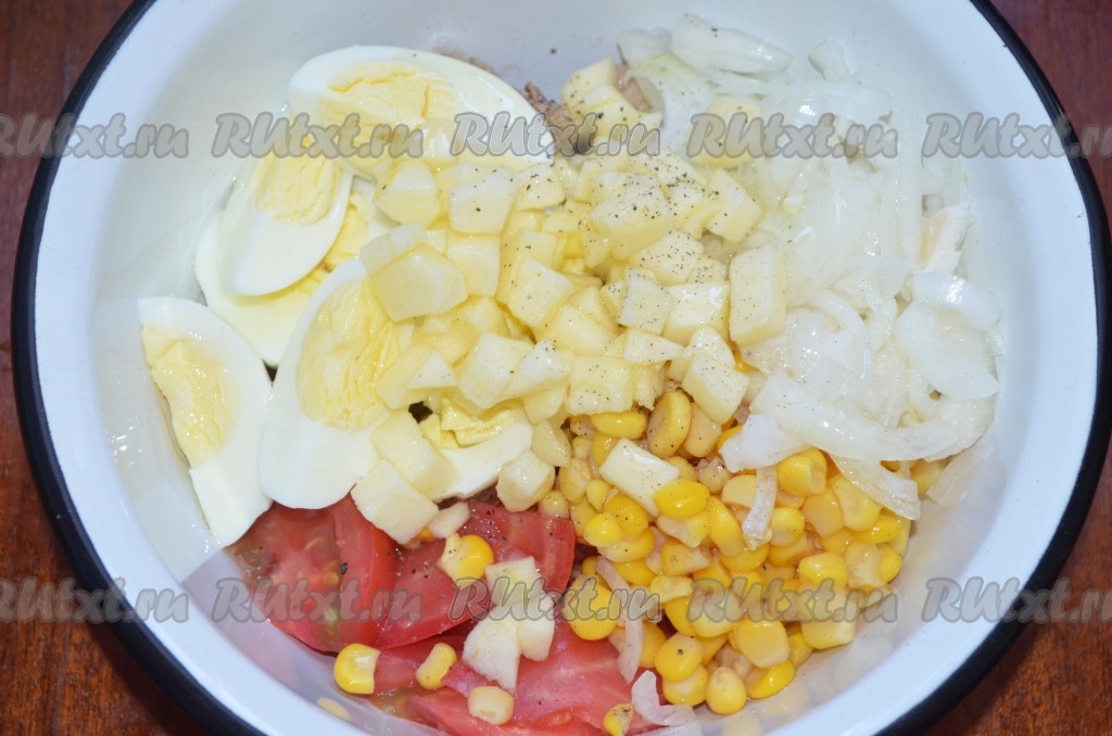 В глубокую миску сложить горбушу, помидоры, яйца, кукурузу, яблоко, лук без жидкости, посолить, поперчить, полить маслом, перемешать.