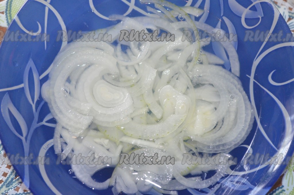 Лук порезать полукольцами, сложить в миску. Посыпать сахаром, залить кипятком и добавить уксус. Оставить мариноваться на 20 минут.