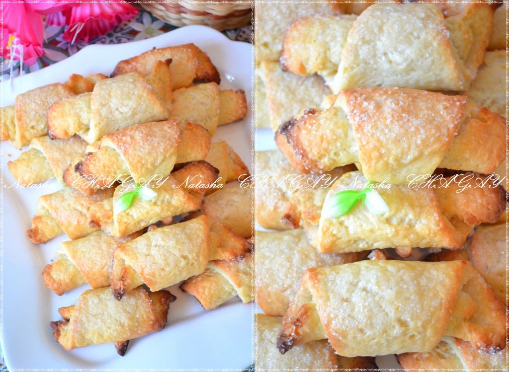 Готовые рогалики с сахаром снять с пергамента, остудить и можно угощаться вкусным печеньем из творога.