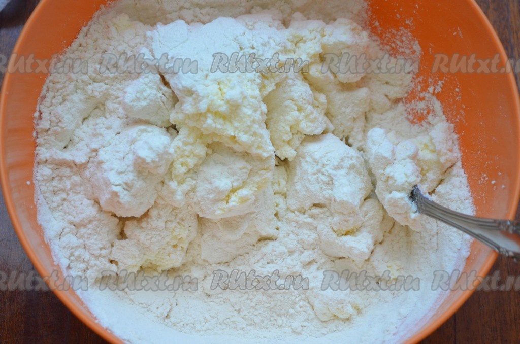 Тесто для печенья должно собраться в шар, получиться мягким. Не стоит забивать тесто мукой, как только перестало быть липнущим к рукам, значит больше не нужно добавлять муку. Убрать творожное тесто в холодильник на 30 минут.