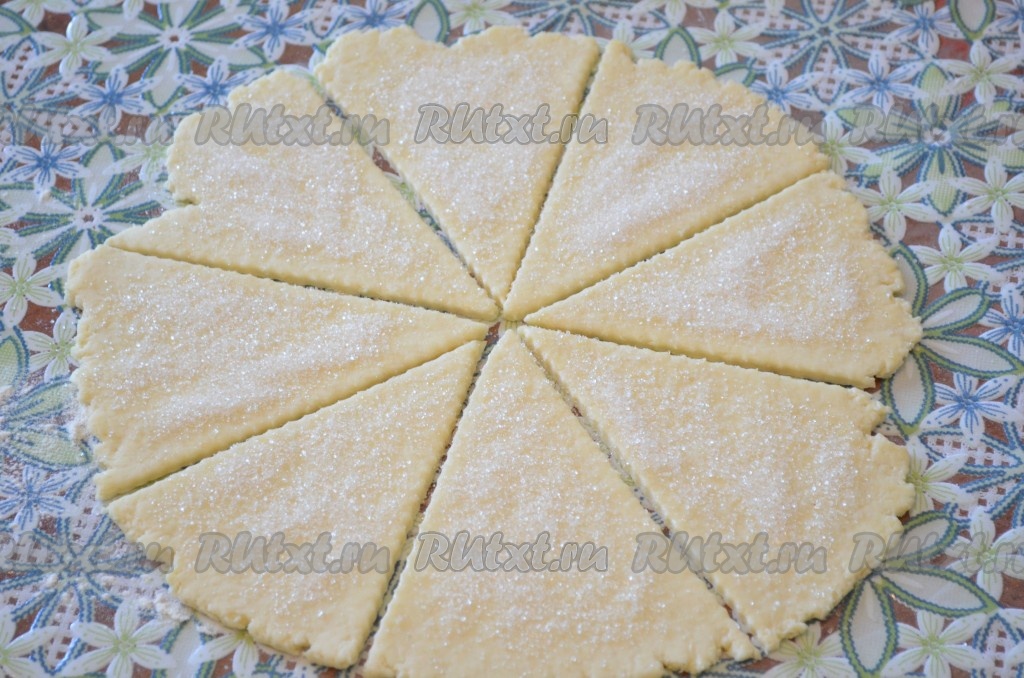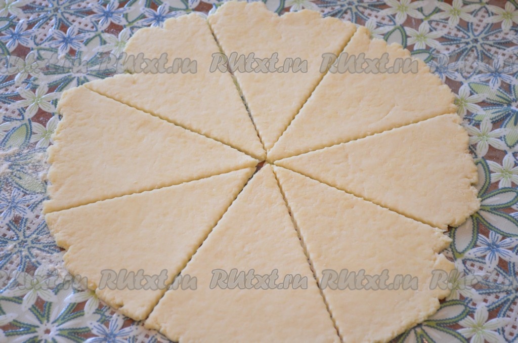 Каждую часть теста на присыпанной мукой поверхности раскатать в круг толщиной примерно 7 миллиметров. Разрезать каждый круг на 8 сегментов.